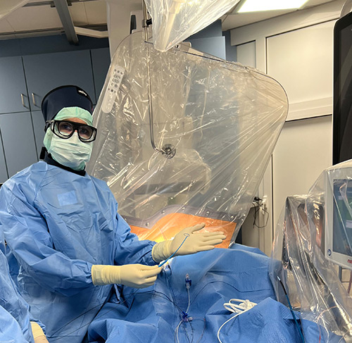 Dr. med. Benjamin Taubald zeigt den Katheter, an dem sich der Kryo-Ballon im linken Herzvorhof entfaltet. Im Ev. Stift kommt jetzt ein Verfahren zum Einsatz, mit dem schonend und effektiv das Vorhofflimmern behandelt wird. Es zeichnet sich durch eine hohe Erfolgsquote, kurze Eingriffszeit und eine schnelle Erholung für die Patienten aus. Foto: GK-Mittelrhein/Jutta Münch