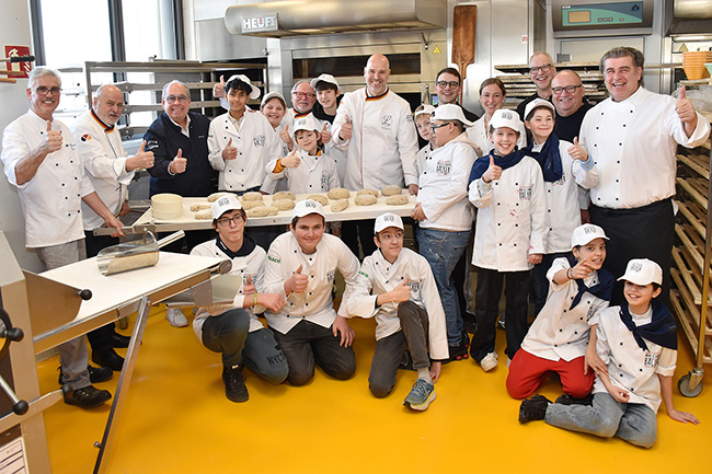 Die eigentlichen Hauptakteure wirbelten getreu dem weiteren Motto „Mitmachen statt Zuschauen!“ nur wenige Räume entfernt gleichzeitig mit Rührschüsseln, Schneebesen und strahlenden Augen durch die HwK-Ausbildungswerkstätten. Hier werden das ganze Jahr über Bäcker und Konditoren zu Gesellen und Meistern ausgebildet. Rund 50 Kinder aus drei Klassen der Freiherr-vom-Stein-Grundschule Koblenz und der Theodor-Heuss-Schule Bendorf probierten sich mit großer Begeisterung in zwei Workshops je nach Alter als Mini- und Junior-Bäcker aus. Angeleitet von den Ausbildern der HwK Koblenz stellten sie in nagelneuer Bäckerkluft leckere Hefeteigteilchen her, die sie hochkonzentriert und mit jeder Menge Spaß dekorierten. Sie produzierten unterschiedliche Teige und lernten das Abbacken und Fertigstellen verschiedener Brotsorten kennen. „Das macht total Spaß!“, „Ist viel leichter als ich dachte!“, „Es ist klasse, dass man so schnell sieht, was man gemacht hat – und lecker ist es auch“, tönte es aus allen Ecken, als die Gründungsmitglieder schließlich in der Backstube auftauchten und den Nachwuchsbäckern neugierig über die Schulter schauten, natürlich Tipps gaben und hier und da professionelle Handgriffe verrieten.