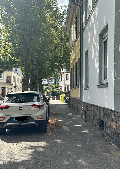 Der Gehweg in der Hans-Böckler-Straße bleibt frei, auch das vom Eigentümer an seinem Haus angebrachte Verbotsschild hat keinerlei Wirkung. Foto: Stadt Neuwied / Ulf Steffenfauseweh