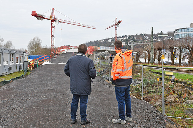 Wie Marco Mather vom Landesbetrieb Mobilität Cochem-Koblenz beim Ortstermin erläuterte, ist das Bauvorhaben technisch anspruchsvoll. So musste unter laufendem Bahnverkehr gebaut werden, was umfangreiche Sicherungsmaßnahmen erforderte. Zudem wurde das Überführungsbauwerk über die Bahngleise zunächst um 1,40 Meter erhöht auf einer tragenden Konstruktion errichtet, um anschließend auf die endgültige Höhe abgesenkt zu werden. Auch die besondere Geometrie der Brücke mit zwei wechselnden Kurvenparametern stellte eine zusätzliche Herausforderung dar.