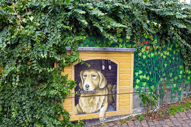 Und die Street Art hört nicht auf! An einer Fassade, umrankt von dichtem Efeu, versteckt sich ein bezauberndes Graffiti eines Golden Retrievers in einer Hundehütte – so realistisch gemalt, dass man fast meint, er würde gleich herauskommen, um einen zu begrüßen. Solche kleinen Kunstwerke zeigen, dass in Siegburg viel Wert auf eine lebenswerte und kreative Umgebung gelegt wird.