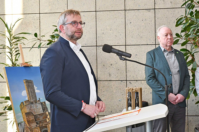 KREIS MYK. Die Kreisverwaltung Mayen-Koblenz öffnet ab sofort erneut ihre Türen für die Kunst aus der Region. Bis zum 1. Mai prä-sentieren die Künstler des Andernacher Kunstkreises Regenbogen94 im Rahmen der Ausstellung „Natur und Kultur im Kreis erleben“ ihre Werke im Kreishaus. Die kostenfreie Aus-stellung ist im 2. Obergeschoss des Kreishau-ses, Bahnhofstraße 9 in Koblenz, zu sehen. Landrat Marko Boos eröffnete die Ausstellung gemeinsam mit dem Kreisbeigeordneten Jens Firmenich. „Es ist mir eine große Ehre, Sie alle hier zur Ausstellung des Andernacher Kunst-kreises Regenbogen94 begrüßen zu dürfen“, betonte der Landrat in seiner Ansprache und hob die besondere Vielfalt der Künstlergruppe hervor. Der Name „Regenbogen“ sei dabei kein Zufall: „Ein Regenbogen entsteht nur, wenn viele Farben zusammenkommen – genau wie hier unterschiedliche Handschriften, Techniken und Blickwinkel zu einem gemeinsamen Bild verschmelzen.“
