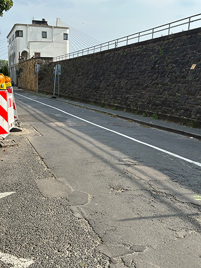 Die Deichstraße ist derzeit in keinem guten Zustand. Sie soll ab Ende des Jahres neugestaltet werden, auch im Hinblick auf die kommende Sanierung der Deichkrone und den neuen Schiffsanleger. Bild: Stadt Neuwied / Ulf Steffenfauseweh
