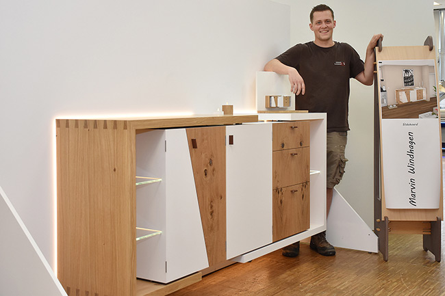 Das beste Meisterprüfungsstück reichte der Bonner Tischler Thomas Klingenhäger ein. Sein Schrank ist eine „Homebar“ und besticht durch einfache Formensprache und schnörkellose Geradlinigkeit. Die Kombination aus verschiedenen Eschehölzern und Dünnschiefer in hochwertiger handwerklicher Ausführung überzeugte die Prüfungskommission, die dafür die diesjährige Höchstpunktzahl 95 von möglichen 100 vergab. Auch in der Wertung für den Design-Preis konnte Klingenhäger einen guten zweiten Platz einfahren. Hier war nur Marvin Windhagen aus dem Hachenburger Familienunternehmen Leyendecker erfolgreicher. Mit seinem „Slideboard“ fertigte der Westerwälder ein pfiffiges Sideboard-Möbel mit Ausziehfunktionen. Holz mal in seinem natürlichen Erscheinungsbild, mal weiß lackiert und Glasböden verleihen dem Prüfungsstück eine unverkennbare Note, in dem sich auch ganz unterschiedliche geometrische Formen ästhetisch wiederfinden – was dann auch mit Platz eins beim Design-Preis belohnt wurde.