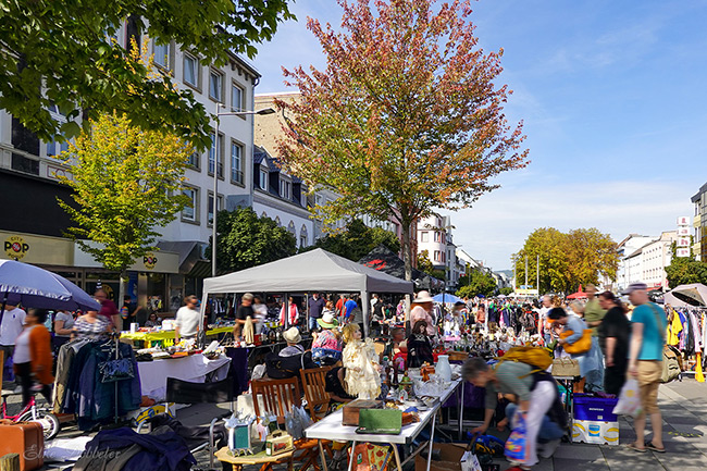 Gerade rechtzeitig war der Brunnen auf dem Luisenplatz fertiggestellt worden, sodass der Neuwieder Septemberflohmarkt sich auch dort wieder ausbreiten konnte – eine kleine Premiere für das „absenkbare“ Wasserspiel, das vor lauter Ständen fast nicht sichtbar war.