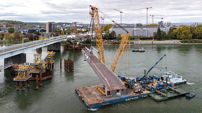 Über mehrere Tage hinweg wurden die per Schiff über den Rhein aus Mannheim angelieferten, hunderte Tonnen schweren Stahlbauteile im Oktober eingehoben. Hierfür wurde ein sogenannter Gittermast-Raupenkran verwendet, der auf einem Ponton im Rhein steht. Mit der Maschine wurden in zentimetergenauer Präzisionsarbeit die Bauteile in ihre Endposition eingehoben. Den Abschluss bildete dabei ein rund 280 Tonnen schweres Stahlbauteil auf der Pfaffendorfer Seite. „Damit haben wir nunmehr rund 60 Prozent des Stahls für den gesamten Überbau der neuen Brücke bereits verbaut“, erklärt der Koblenzer Tiefbauamtsleiter Dr.-Ing. Kai Mifka.
