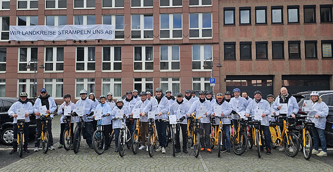 Mit einer gemeinsamen Fahrradaktion durch die Landeshauptstadt Mainz haben am Freitag alle 24 Landrätinnen und Landräte in Rheinland-Pfalz auf die angespannte Lage der Landkreise aufmerksam gemacht. Unter dem Motto „Wir Landkreise strampeln uns ab!“ fuhren sie von der MEWA-Arena quer durch Mainz ins Regierungsviertel und machten damit sichtbar, dass die kommunale Ebene seit Jahren am Limit arbeitet – finanziell, organisatorisch und personell.