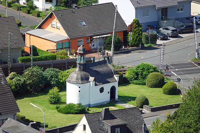 Der Blick von oben ist mehr als nur eine Aussicht. Er lädt ein, abzuschalten und die Perspektive zu wechseln. Der Rhein zieht wie ein Band durch die Landschaft, die Dächer kuscheln sich aneinander, und die Schienen führen in die Ferne — plötzlich wirkt alles ruhig und geordnet. Vielleicht erkennen wir uns in der winzigen Kapelle wieder, die fest und unerschütterlich im Dorf steht.