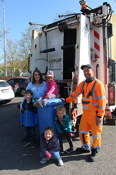 Zielgruppe sind die Vorschul- und Grundschulkinder aus dem Landkreis Neuwied. Im Rahmen des Programms lernen sie nicht nur, welcher Müll in welche Tonne gehört, sondern dürfen auch selbst mitanpacken: Denn ein Highlight des Programms ist der Besuch eines Müllfahrzeugs auf dem Kita-Gelände. Dann heißt es: „Ran an die Tonne!“ Unter Anleitung eines echten Müllwerkers dürfen die kleinen Müllprofis selbst Mülltonnen bewegen und kippen.