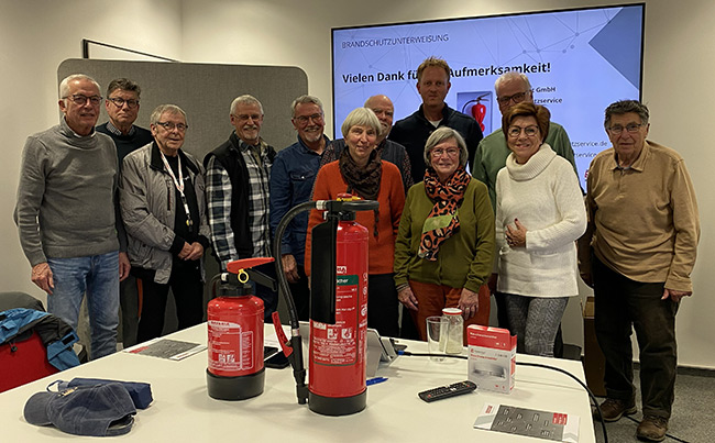 In den Räumlichkeiten der Firma Schmitt informierte Christian Dilling, zuständig für den betrieblichen Brandschutz, über potenzielle Gefährdungen im Haushalt, wirksame vorbeugende Maßnahmen sowie das richtige Verhalten im Brandfall und – mit praktischer Übung – die sachgerechte Handhabung von Feuerlöschern. Nützliche Hinweise erhielten die Teilnehmenden auch zu den Unterschieden zwischen Baumarkt- und Fachhandels-Feuerlöschern sowie zur korrekten Aufbewahrung und Nutzung einer Löschdecke im Haushalt.