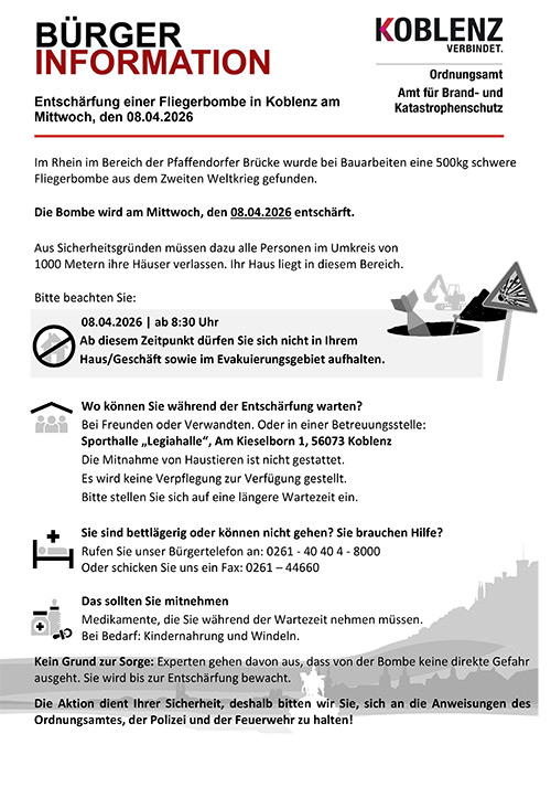 An die von der Evakuierung betroffenen Haushalte werden im Laufe des Karsamstags entsprechende Handzettel mit detaillierten Informationen verteilt. Für Fragen aus der Bevölkerung ist ab sofort bei der Feuerwehr Koblenz ein Bürgertelefon unter der Rufnummer 0261/40404-8000 eingerichtet.