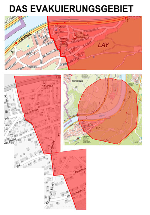 Betroffen ist hier ein Bereich des Stadtteils Lay, die dortige Kindertagesstätte sowie der Campingplatz Güls, der Sportboothafen, die Bahnstrecke entlang der Mosel und die Bundesstraßen 416 und 49. Die Bundesstraße 327 (Hunsrückhöhenstraße) wird befahrbar bleiben.