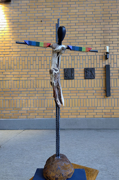 Peter Schwarz hatte mehrere künstlerische Werke aus seiner Arbeit mit Holz mitgebracht. Ein Kreuz aus hartem Stahl zeigt den gekreuzigten Jesus aus Rebholz mit einem schwarzen Kopf; seine Arme bilden sich in den Farben der Friedensflagge ab. Jesus wird hier als ein mitleidender Mensch gesehen, der solidarisch ist mit allen, die diskriminiert und rassistisch beleidigt werden.
