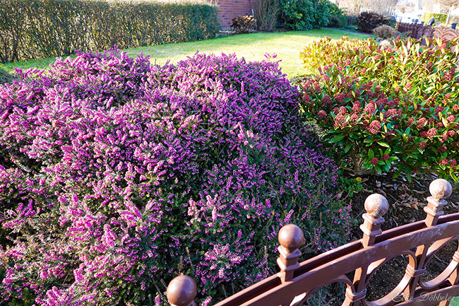 Mir war gar nicht wirklich bewusst, dass eine Erika zu einem solchen Busch heranwachsen kann. Bestimmt schon öfter gesehen, aber nie so wahrgenommen. Hier jedenfalls ist sie ein echter Blickfang, besonders dann, wenn die Wintersonne die Blüten zum Strahlen bringt.