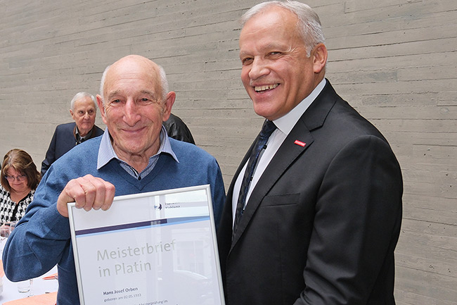 Der 92-jährige Klempner- und Installateurmeister Hans Josef Orben erhielt im Rahmen der HwK-Feier seinen „neuen“ Meisterbrief in Platin für ein 70-jähriges Meisterjubiläum.Foto-Quelle: Michael Jordan)