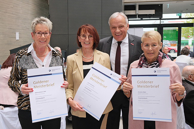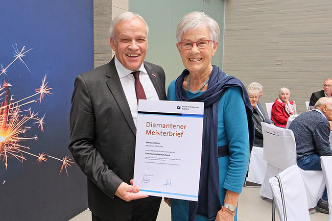 Mit Bäckermeister Hubert Quirmbach und Dachdeckermeister Artur Wirschem kamen auch zwei Jubilare zu Wort, die sich im Namen aller Gäste bei der HwK für die Ausrichtung dieser Feier bedankten und ihrerseits berichteten, welche Bedeutung die Meisterqualifikation in ihrem Leben spielte. Das ging weit über die berufliche Dimension hinaus auch ins Privatleben. So entstanden Freundschaften unter den Meisterschülern, die auch mehr als ein halbes Jahrhundert später immer noch halten.