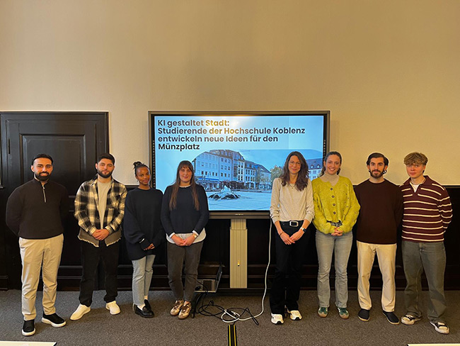 Koblenz, 20. November 2025 – Foto: © Hochschule Koblenz - Wie kann Künstliche Intelligenz helfen, Städte lebenswerter zu gestalten? Mit dieser Frage beschäftigte sich die Studierendengruppe „KI gestaltet Stadt“ der Hochschule Koblenz mit Unterstützung der Koblenz-Stadtmarketing GmbH. Ziel des Projekts war es, Transformationsprozesse am Beispiel eines Stadtplatzes mit Hilfe einer KI-Anwendung zu testen. Die sechs Studierenden stellten am 20. November ihre Ergebnisse im Rathaussaal vor.