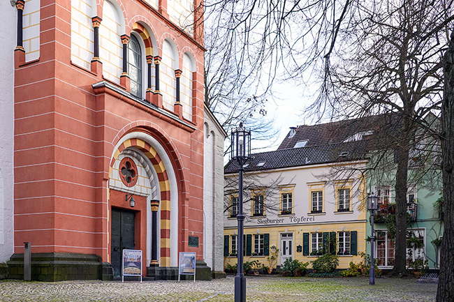 Das Herzstück der Stadt ist zweifellos die beeindruckende, rot-weiß gestaltete St. Servatius Kirche am Kirchplatz. Mit ihrer romanischen Architektur und den markanten Bögen ist sie ein echter Blickfang und ein Zeugnis der langen Geschichte Siegburgs.