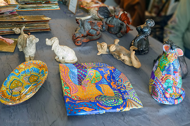 Die Besucher genossen es, zwischen Kunstwerken zu schlendern, bei Kaffee und Kuchen zu verweilen und dabei ins Gespräch zu kommen. So wurde auch der graue Sonntag zu einem warmen, bunten und erfolgreichen Ausstellungstag.