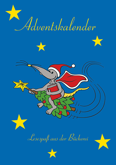 Lesli als Weihnachtsmann reitet auf einem Weihnachtsbaum, blauer HintergrundDer „Adventskalender“ für die 1. bis 4. Klassen enthält in roten Umschlägen je ein Kapitel und Rätsel aus einer winterlich-weihnachtlichen Geschichte für jeden Schultag bis Weihnachten. Aus den Lösungen der Tagesrätsel ergibt sich ein Lösungssatz, den die Kinder in der Bibliothek abgeben und dort an einer Verlosung und Preisverleihung teilnehmen können.