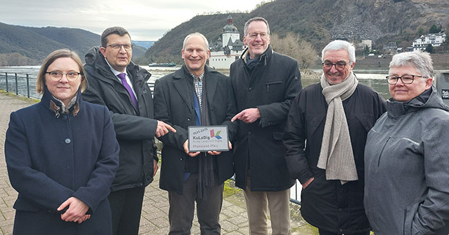 (Bild: Projektteam KuLaDig-RLP / Florian Weber) Dem Präsidenten der Universität Koblenz, Prof. Dr. Stefan Wehner, hat der rheinland-pfälzische Innenminister Michael Ebling am Freitag, 24. Januar 2025, in Kaub einen Förderbescheid aus dem Bereich der Kommunalentwicklung überreicht. Gefördert wird mit rund 284.000 Euro die Fortsetzung des Projekts „Digitale Erfassung und Präsentation von Kulturlandschaften in Rheinland-Pfalz (KuLaDig RLP)“ für die Jahre 2025 und 2026.