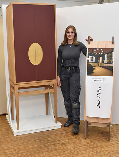Jule Nelles aus Bad Neuenahr-Ahrweiler lieferte mit ihrem Weinschrank nicht nur eine meisterhafte Qualität ab, sondern erreichte dank guter Gestaltung auch Platz drei beim Designpreis.Foto-Quelle: HwK Koblenz / Jörg Diester