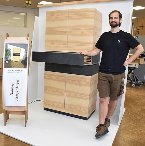 Der Bonner Tischler Thomas Klingenhäger erreichte mit seinem Meisterprüfungsstück die höchste Punktzahl aller 14 eingereichten Arbeiten und zusätzlich einen zweiten Platz beim Designpreis. Foto-Quelle: HwK Koblenz / Jörg Diester