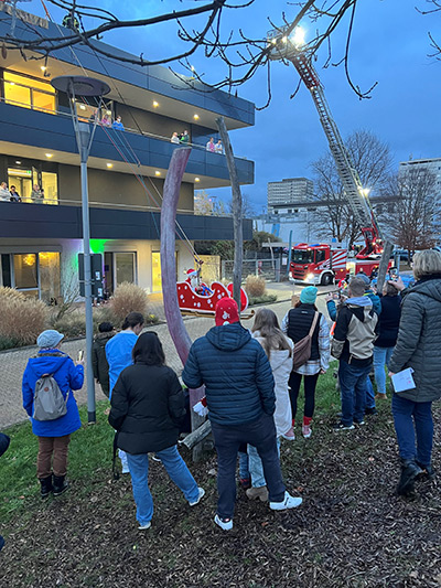KOBLENZ. (Fotos: GK-Mittelrhein/Luisa Gitzen) - Strahlende Gesichter, große Augen und eine Extraportion Weihnachtszauber: Auch in diesem Jahr kam der Nikolaus nicht wie üblich durch die Tür, sondern von oben! In seinem Schlitten schwebte er vom Dach der Klinik für Kinder- und Jugendmedizin am Kemperhof herab und sorgte für staunende Blicke bei Groß und Klein. Unterstützt wurde er von zwei besonderen Helfern, Spiderman und Captain America, die sich ebenfalls mutig vom Dach abseilten. Gemeinsam überbrachte das Trio Geschenke und jede Menge Weihnachtsfreude. „Eine wirklich schöne Aktion – man sieht an den leuchtenden Kinderaugen, wie viel Freude sie bereitet“, hieß es aus den Reihen der Familien.