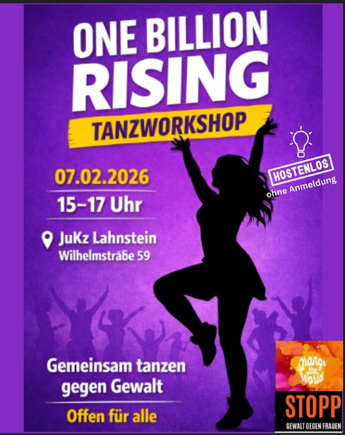 Zur Vorbereitung der Tanzaktion findet am 7. Februar 2026 von 15 Uhr bis 17 Uhr ein Tanzworkshop im Jugendkulturzentrum, Wilhelmstraße 59, 56112 Lahnstein statt. Der Workshop ist offen für alle Interessierten, auch ohne tänzerische Vorkenntnisse. Eine Anmeldung ist nicht notwendig.