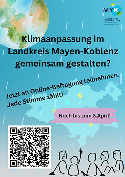 Die Teilnahme an der Online-Umfrage ist noch bis zum 3. April möglich, dauert 10 Minuten und kann bequem über den QR-Code aufgerufen werden. Wer Unterstützung benötigt oder den direkten Link zur Umfrage erhalten möchte, kann sich per E-Mail an klimaanpassung@kvmyk.de wenden.