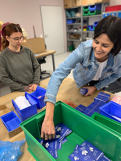 Auch auf Seiten der Tauschpartner brachte der Schichtwechsel wertvolle Erfahrungen mit sich. Die Vorsitzende der Geschäftsführung der Agentur für Arbeit Neuwied, Stefanie Adam, arbeitete für einen Tag in der Abteilung Montage und Verpackung einer WfbM. Ob beim Sortieren, Etikettieren oder Verpacken – sie zeigte vollen Einsatz und ließ sich mit viel Offenheit und Interesse auf die Abläufe und Kolleg:innen in der Werkstatt ein. Besonders beeindruckt war sie von der strukturierten Organisation und dem kollegialen Miteinander. „Ich habe heute nicht nur Arbeitsprozesse kennengelernt, sondern vor allem Menschen, die mit viel Engagement und Genauigkeit arbeiten. Der direkte Einblick in die Werkstatt hat mir gezeigt, wie wichtig sinnstiftende Arbeit und echte Teilhabe sind – und wie viel Potenzial in den Beschäftigten steckt“, so Stefanie Adam.