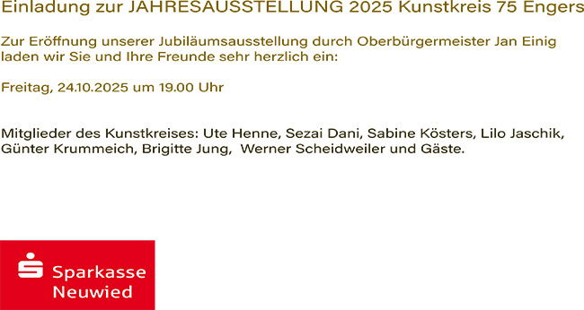 Der Kunstkreis 75 Engers feiert in diesem Jahr sein 50-jähriges Bestehen – ein halbes Jahrhundert kreativer Vielfalt, Inspiration und Gemeinschaft. Aus diesem Anlass lädt der Verein herzlich zur großen Jubiläumsausstellung im Alten Rathaus Engers ein.