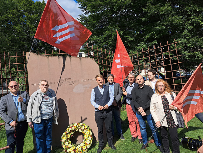 Neuwied. (Foto: Frank Hachemer) - Rund 60.000 Mitglieder des Demokratieschutz-Bündnisses „Reichsbanner Schwarz-Rot-Gold“, auch aus der Neuwieder Ortsgruppe, waren im August 1931 anlässlich des Verfassungstages auf dem Koblenzer Clemensplatz zur gemeinsamen Kundgebung für die Demokratie und gegen Extremismus zusammengekommen. Das nahm nun eine Abordnung des 1933 von den Nationalsozialisten verbotenen Bündnisses um den Landesvorsitzenden Lennard Oehl gemeinsam mit dem bekannten Neuwieder Leserbrief-Autoren und Menschenrechts-Aktiven Manfred Kirsch zum Anlass, um der eigenen damaligen Opfer und aller weiteren NS-Opfer am Mahnmal auf dem Reichenspergerplatz zu gedenken, das sich direkt am Ort der gewaltigen Kundgebung von 1931 befindet. „Besonders auch der Blick auf die damalige Entwicklung zeigt, wohin das Wählen extremistischer Parteien führt“, mahnen die heute friedlich mit politischer Bildung und Erinnerungskultur für Demokratie werbenden Republik-Verteidigerinnen und -Verteidiger.